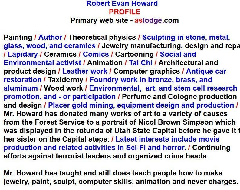 OVER 2,000 INSPIRATION, SKULL-O-GRAMS, AND MORE... https://www.youtube.com/user/robert0howard/videos?sort=dd&view=0&shelf_id=0 https://www.youtube.com/channel/UCYF8aAaPKClTHLhqDwKNEXw https://www.youtube.com/channel/UCbC_AKHYXeDTjLuCyCcCBeA/videos?view=0&sort=dd&shelf_id=1 https://www.youtube.com/channel/UCAf67EjBhTZFPRVyVSfnLig Robret Evan Howard on quora.com / https://www.quora.com/profile/Robert-Evan-Howard ANSWERED 12,313 QUESTIONS / They kicked me off for bad mouthing China and Russia, but kept 7,900 of my anseres which are still gettling hits. VIEWED 1,300,201 TIMES AS OF 3-26-22. Mr. Howard maintains over 114 web sites dedicated to raise awareness and / or funds for STEM CELL RESEARCH - ENVIRONMENTAL PROJECTS - FREE EDUCATIONAL PROJECTS - ARTS PROJECTS - and to establish and promote activities which wll provide FUNDING IN PERPETUITY for those projects without personal compensation. He has also donated over one hundred paintings and sculptures to the project. Since 1972 when Mr. Howard began this project his work has been featured in his own galleries, malls, magazines, new papers, public protests, and exhibitions, television through the Utah Department of Wildlife Resources and television with his animations, and internationally via the internet. Over 5,000,000 hits on YouTube. Mr. Howard's theory on the: ( CREATION OF THE UNIVERSE ) thecreationoftheuniverse.com creationoftheuniverse.com creationoftheuniverse.org |